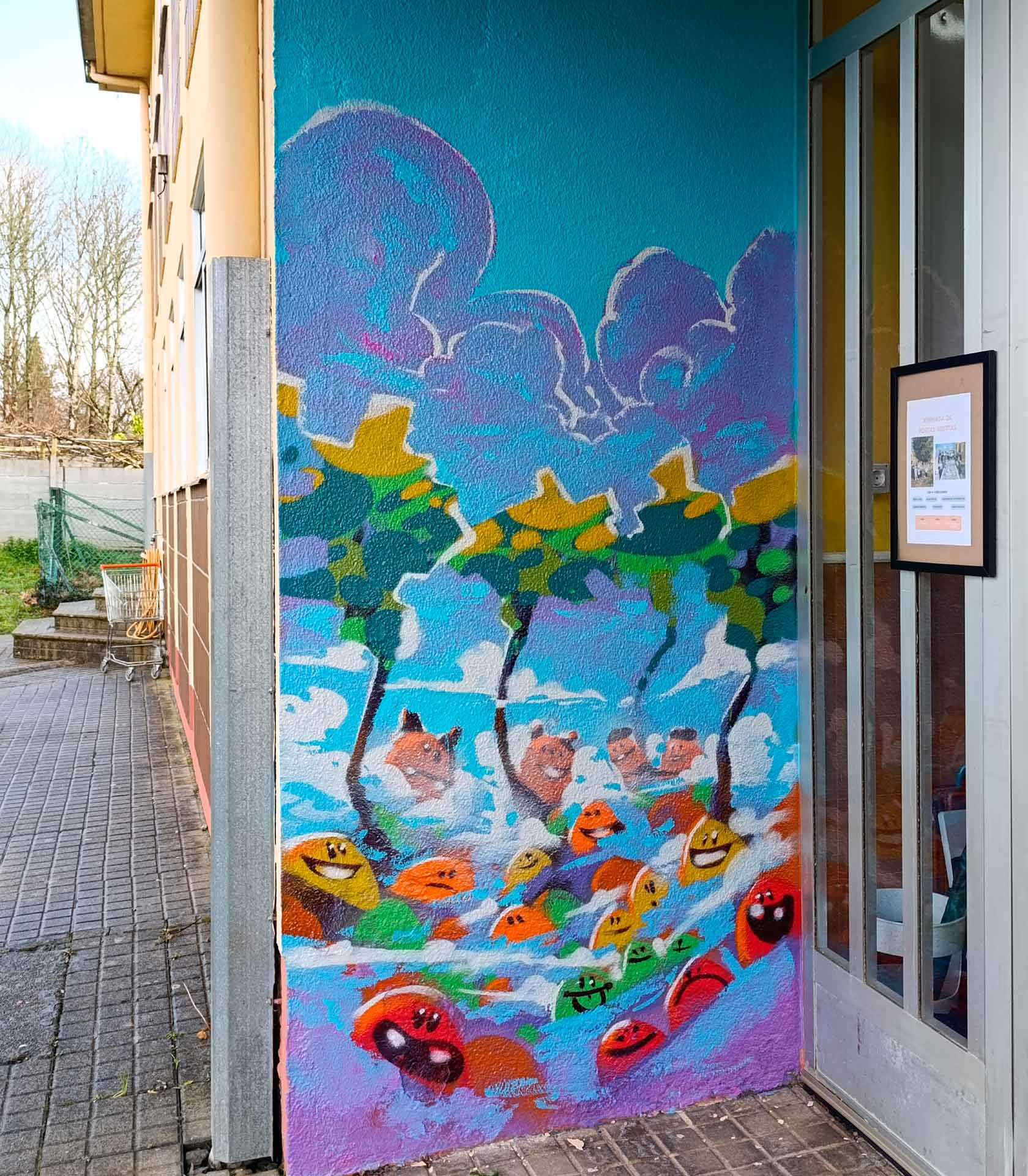 Por último, una vez finalizadas las jornadas con el alumnado, realizamos un trabajo posterior de acabado. Nos encargamos de perfilar formas, reforzar líneas y equilibrar colores. De este modo, se unificaron los elementos pintados por los niños. Finalmente, el resultado son dos murales integrados en el espacio del centro, fruto de un proceso creativo participativo.