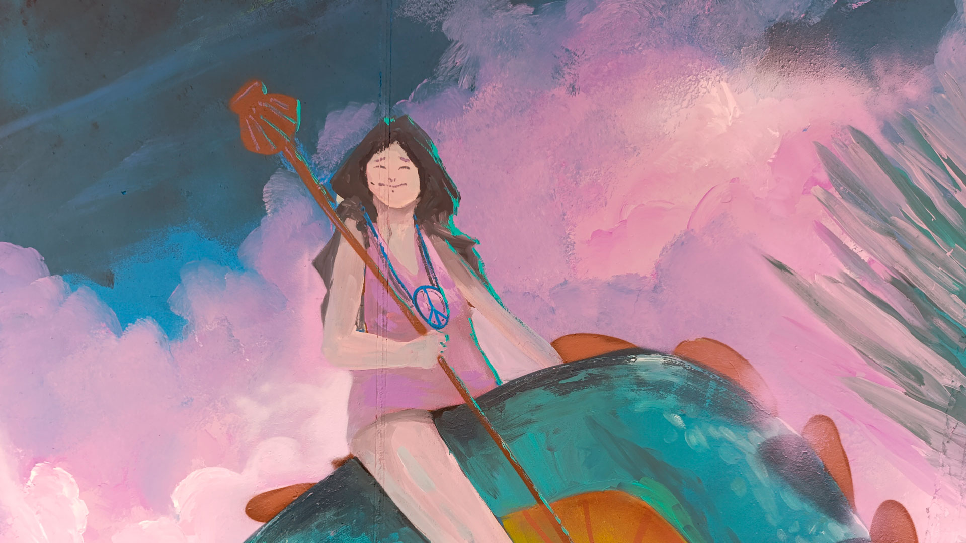La ejecución técnica se centró en la pintura plástica. Primero preparamos el muro y aplicamos una base uniforme con pistola para asegurar cobertura y agarre. Después trabajamos un degradado general que sirvió de fondo para toda la escena. A partir de ahí fuimos construyendo los diferentes elementos con brocha y rodillo. La única zona realizada con spray fue la tipografía, donde necesitábamos líneas más limpias y una aplicación más precisa. Con esta combinación conseguimos unificar el conjunto y mantener control sobre cada fase del proceso.