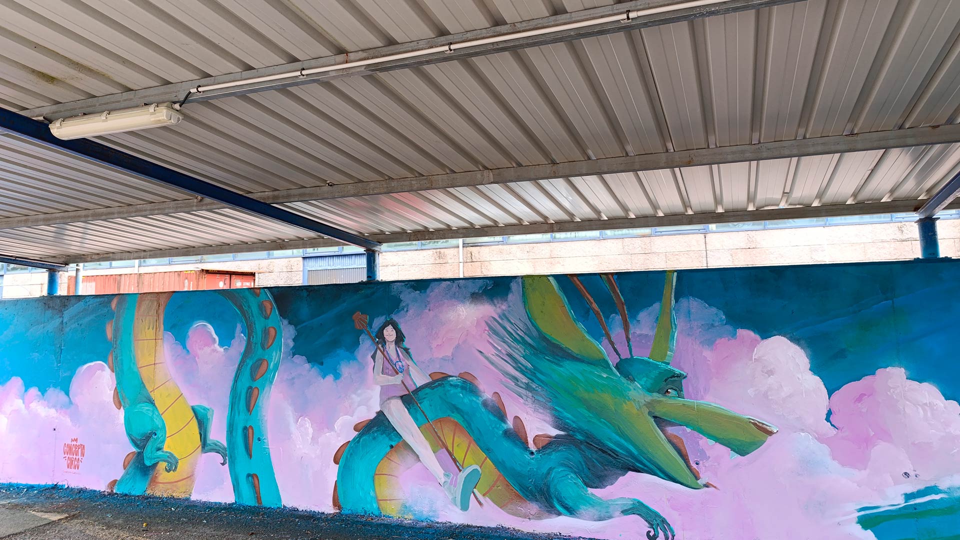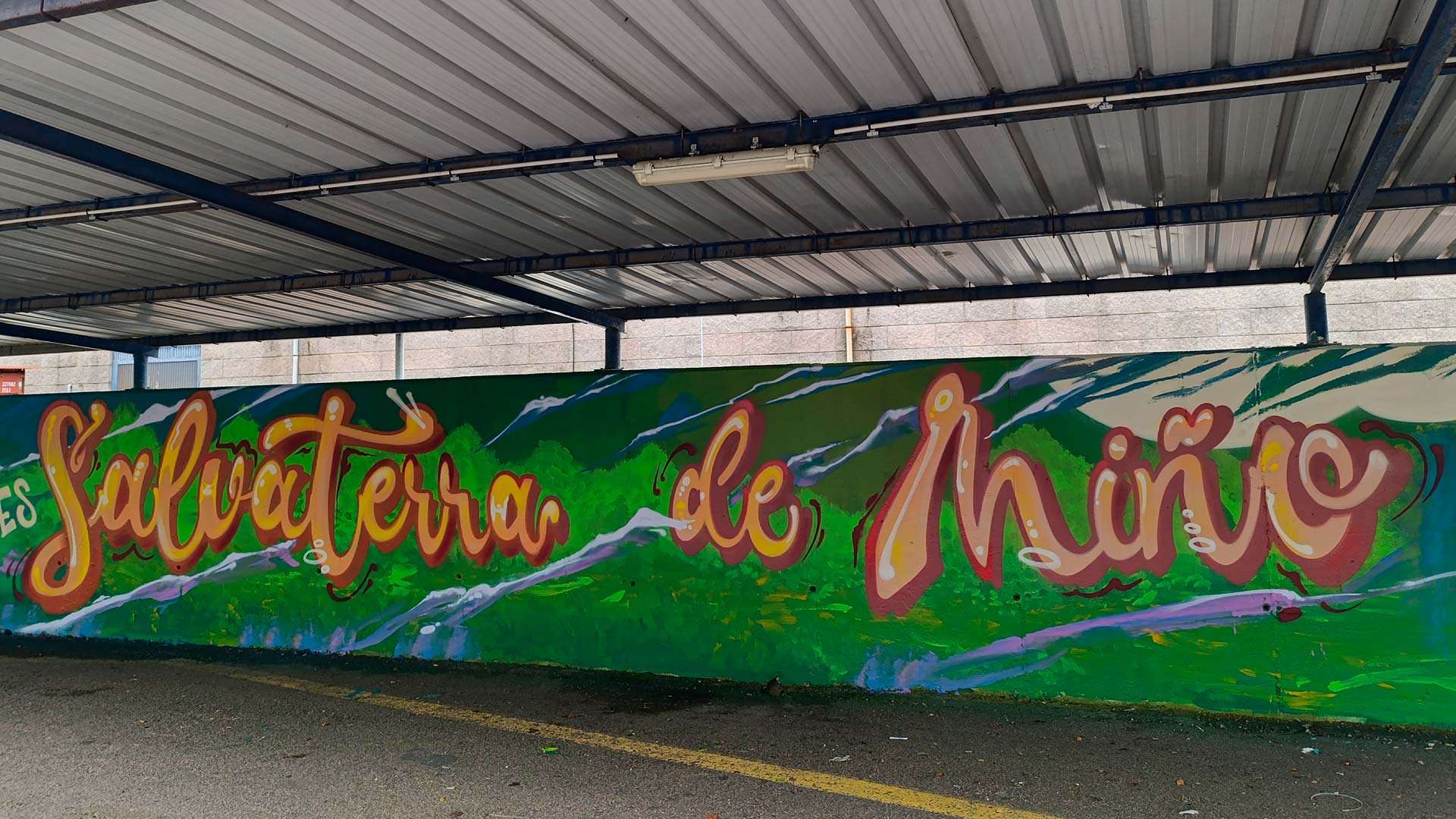 Durante tres días estuvimos en el IES Salvaterra de Miño para pintar un mural de unos setenta metros de longitud en los accesos del centro. El encargo llegó con una idea clara: trabajar una temática que conectara con el alumnado y que mostrara la lectura como punto de partida para imaginar, aprender y transformar. Desde ahí desarrollamos una composición en la que un niño leyendo da origen a una escena completa donde aparecen un bosque, una aventura protagonizada por una chica y una tipografía con el nombre del instituto.