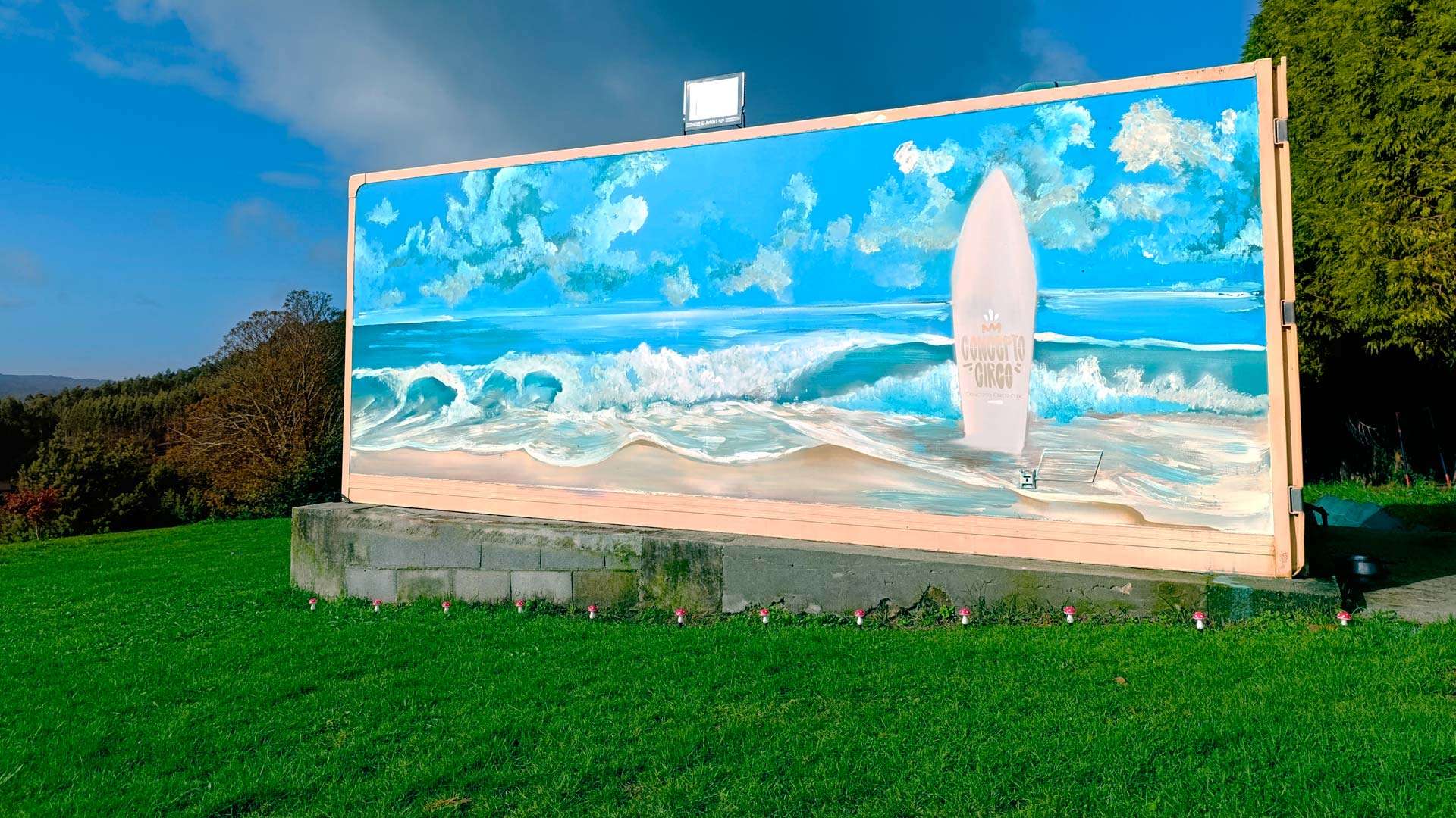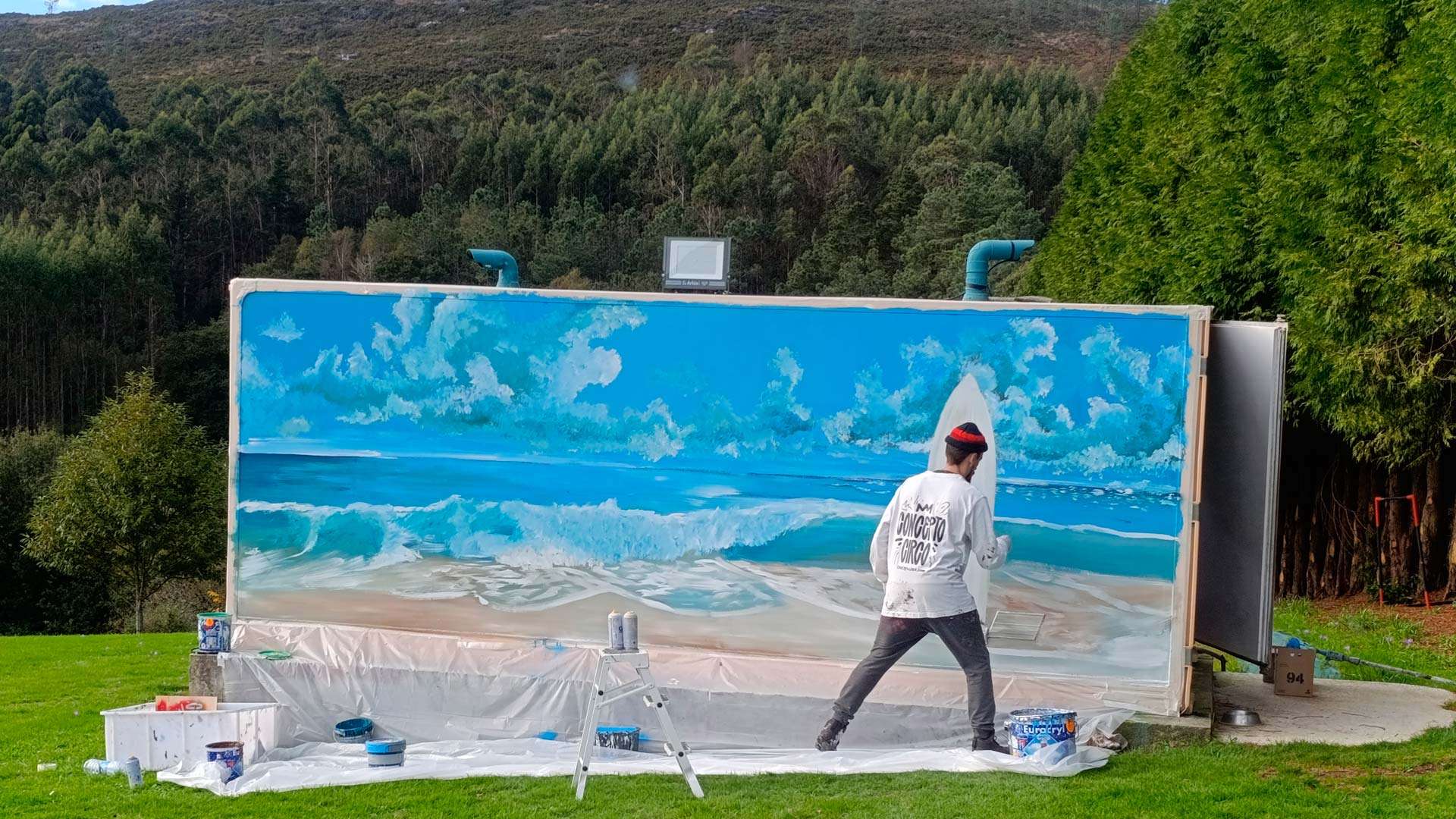 El contenedor contaba con una base de pintura específica para estructuras metálicas, muy resistente y adecuada para exteriores. Gracias a esa capa pudimos trabajar directamente con pintura plástica, que ofrece un acabado uniforme y duradero. Optamos por aplicar todo con brocha y rodillo, una técnica que permite controlar mejor los bordes, las transiciones y la lectura del paisaje desde distintas distancias.