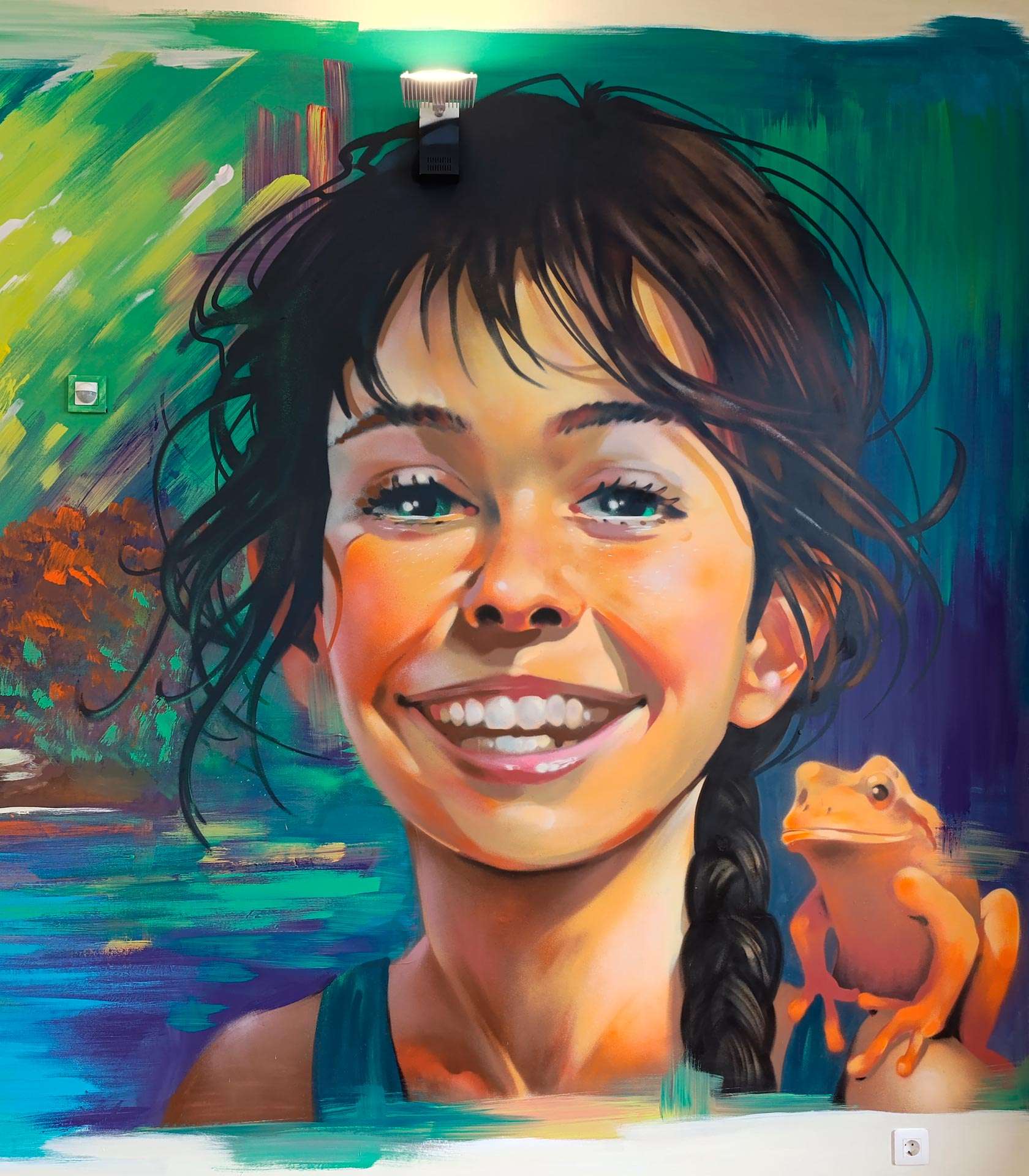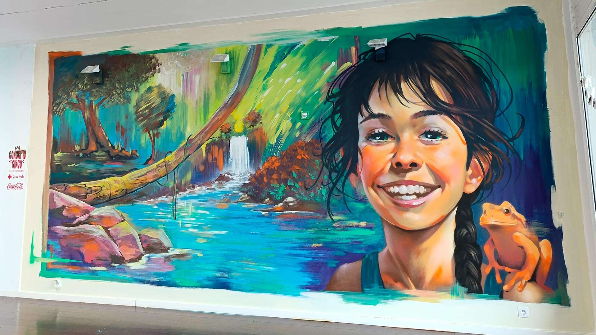 El mural se inspira en el agua como símbolo de vida, conexión y movimiento. El manantial de Fontoira sirvió como punto de partida para la temática y el color. En la composición destaca el retrato de una joven sonriente, acompañada por una rana, dentro de un paisaje cargado de color.